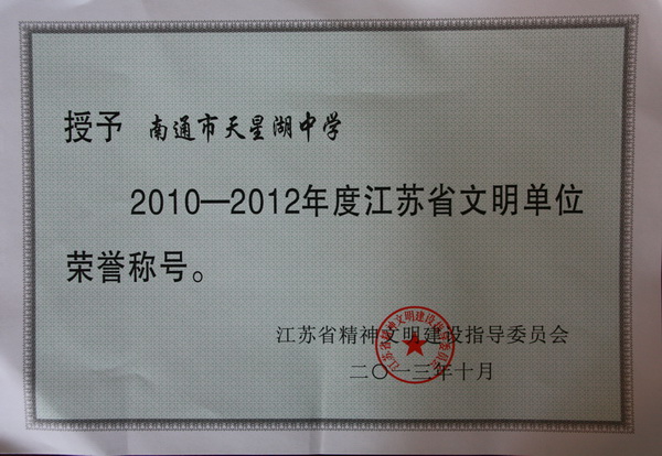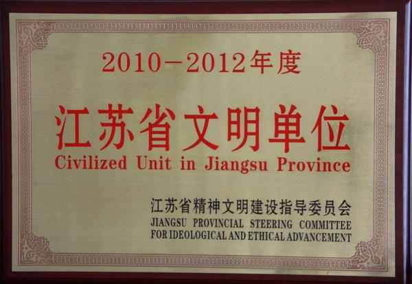 2013年10月,江苏省精神文明建设指导委员会授予我校“2010—2012年度江苏省文明单位”的荣誉称号和荣誉铜牌,以表彰我校近年来在精神文明建设方面取得的突出成绩。