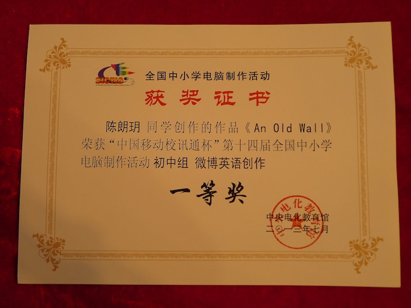今年本次活动共收到全国31个省市参赛作品总数为26822件,入选全国决赛的作品有1452件,分别获得一二三等奖。活动获奖难度极高,我校陈朗玥同学的“微博英语创作”(初中组)作品《An Old Wall》在全国众多优秀作品当中脱颖而出,代表江苏省此项目唯一一名选手成功进入全国总决赛。