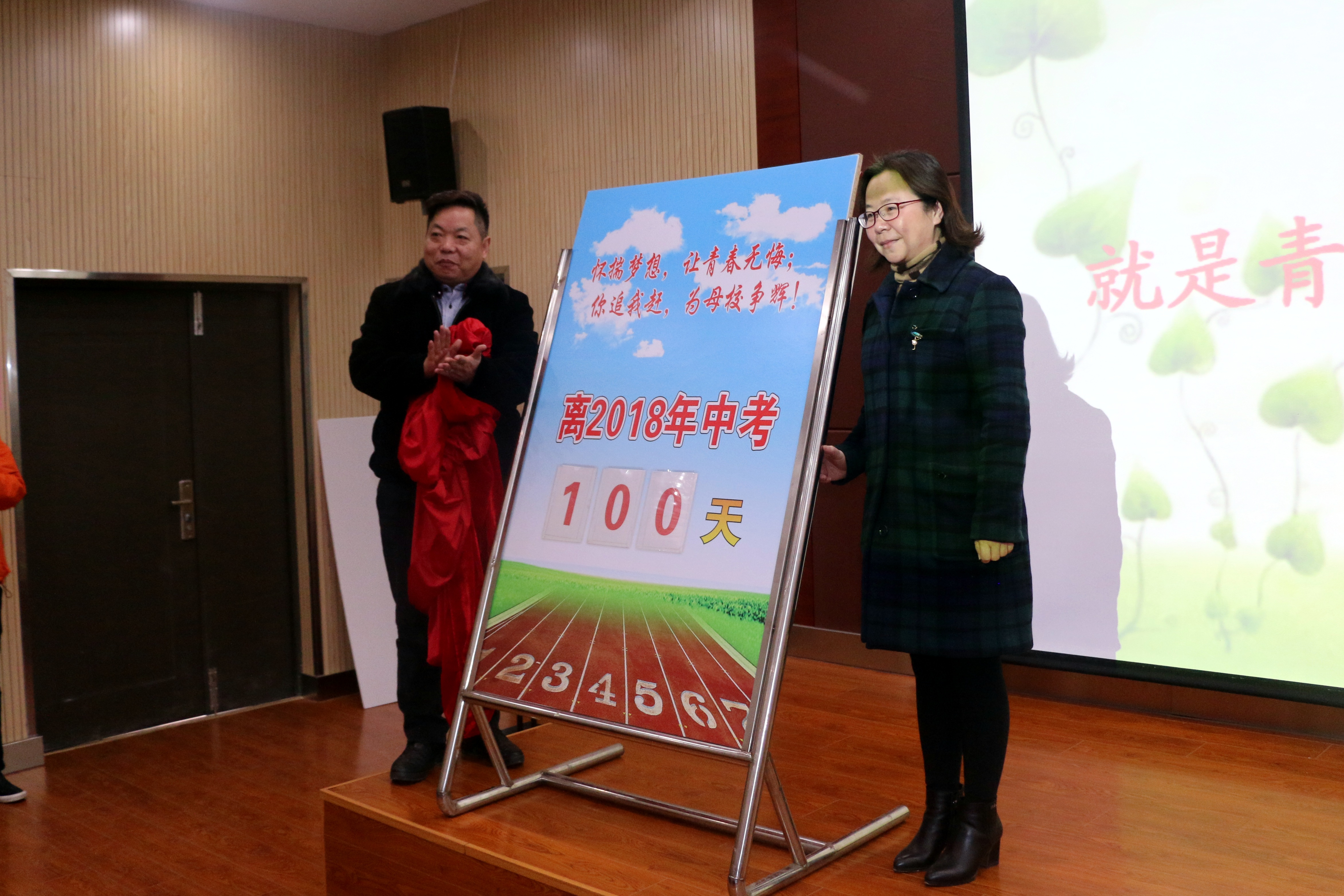 大会渐入高潮,姚敏校长和盛建新书记揭下中考百天倒计时牌的帷幕。中考一百天,真的来了,箭已在弦。九年级全体学生发出了战斗呐喊:“我们以青春的名义宣誓:我将用智慧培育理想,不负父母的期盼。我将用汗水浇灌希望,不负恩师的厚望。我将用信心铸就目标,不负青春的理想。珍惜一百天,让智慧闪光!拼搏一百天,让斗志昂扬!奋斗一百天,让梦想飞翔!”