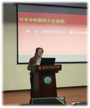 接着初三教师代表虞玉华老师真挚而深情地讲述了自己毕业班教学的心路历程,并寄语全体师生齐心协力、携手共进,她的话极大地鼓舞了同学们的斗志。
