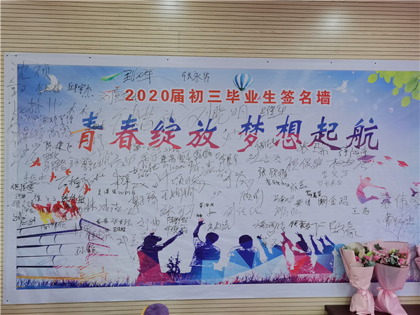 最后,在《放心去飞》的歌声中,2020届九年级毕业典礼落下帷幕,全体师生在准备好的毕业墙上留下了自己的签名。