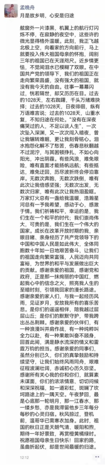 在中国政府包机上,孟晚舟发表感言。她说,在中国共产党的领导下,我们的祖国正在走向繁荣昌盛,没有强大的祖国,就没有我今天的自由。“有些风浪,难免艰险,唯有直面才能扬帆远航;有些抵达,难免迂回,历尽波折终会停泊靠岸。无数次奔跑,无数次跌倒,唯有此次让我倍感坚强;无数次出发,无数次归家,唯有此次让我热泪盈眶。”