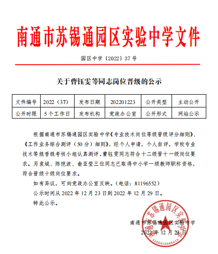 南通市苏锡通园区实验中学2022年度领导班子总结报告公示