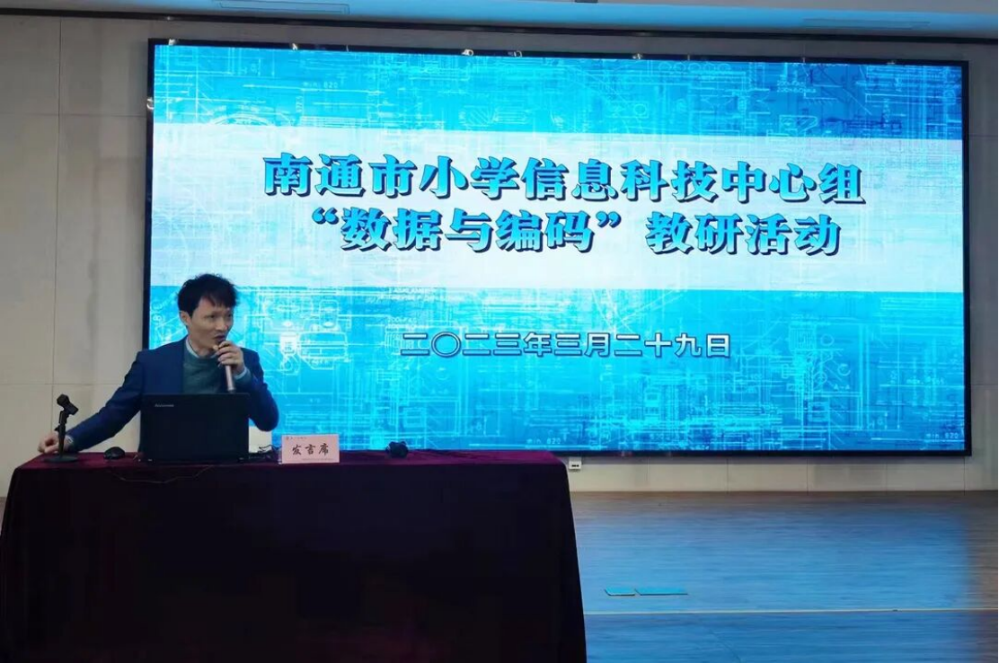 海安市实验小学佘友军老师作《“数据与编码”模块中跨学科主题学习的教学实践》专题报告,佘老师从跨学科主题学习的内涵、跨学科主题学习的困境以及如何开展跨学科学习三个方面展开深度分析。佘老师从理论到实践,深入浅出地为老师们提供了可以落实到课堂的教学建议,也为老师们指引了前进的方向。