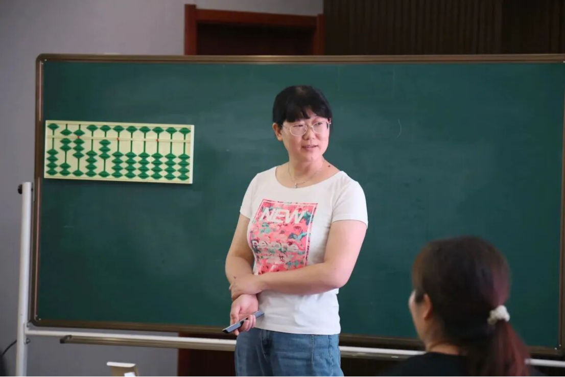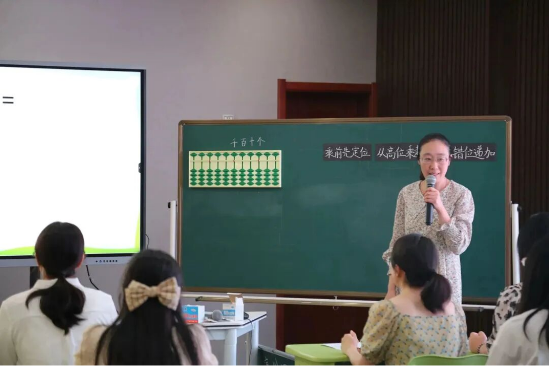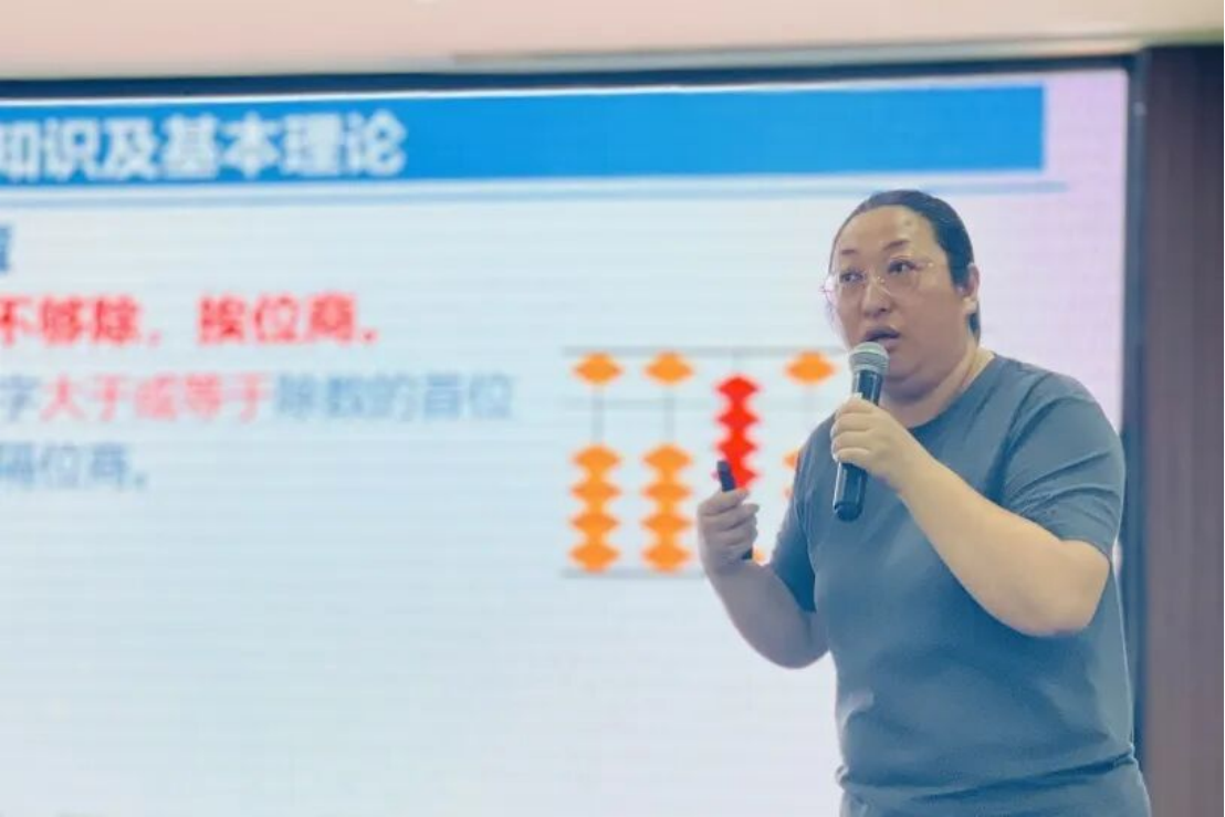 省珠心算种子教师徐宝琴,杨美娟分别对珠心算乘、除法基础知识及教材进行了解读,老师们一边专注地听着,一边认真地记着笔记,还不时地拨拨算盘。