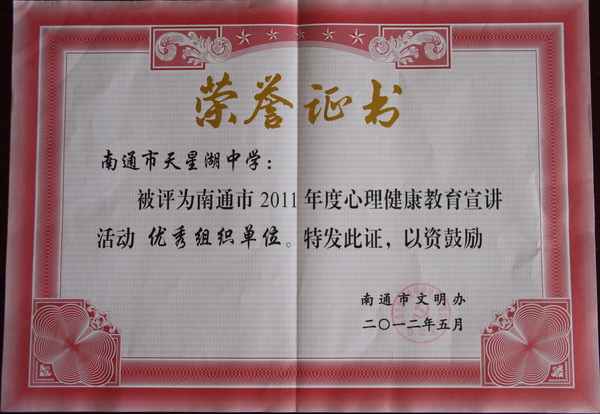 最近,我校被南通市文明办评为南通市2011年度心理健康教育宣讲活动优秀组织单位。 如今,学生的心理压力普遍比较重,我校由国家二级心理咨询