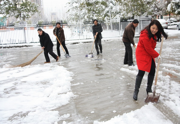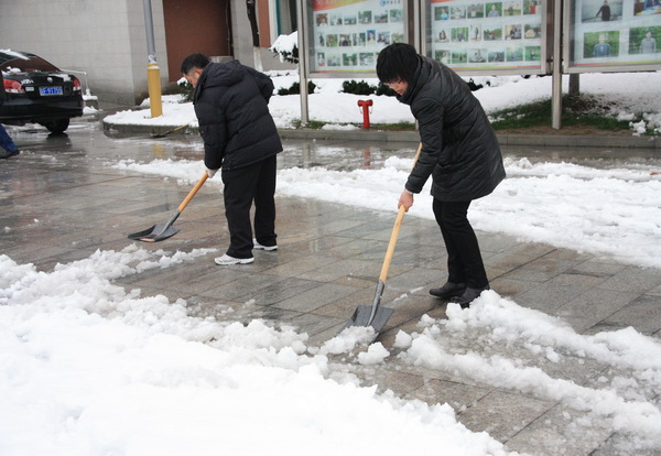 昨晚,一场纷纷扬扬的大雪如约而至。清晨,推开门窗,只见满世界银装素裹,天地相连。但难得一见的雪后美景并未让徐新民校长驻足欣赏,他首先想到的是校园安全,学生安全。 一清早,徐校长与当日的导护人员迎着还在飘飞的雪花和路面厚厚的积雪,早早地驱车来到校园,察看校园道路雪情,发布行走安全警示,布置清扫积雪任务。 一时间,学校所有中层以上领导和党员同志,有的拿着推耙,有的拿着铁铲,有的拿着扫帚,在学校主干道和人流量较大的路上纷纷推雪、铲雪、扫雪。尽管北风劲吹,天气寒冷,但高强度的体力活儿还是让大家汗水淋漓,不由得解开或者脱下了羽绒服。当大家看到原本平坦、宽阔的路面从厚厚的积雪中重又露出真容的时候,心中充满了胜利的喜悦。 校园里最早出来扫雪的人是食堂的陈师傅、马师傅。早晨6点,是寄宿生就餐的时间,两位师傅看到食堂四周道路被大雪覆盖,想到寄宿生出入食堂不便,甚至会发生危险,于是两人不等领导安排,就主动地在寄宿生进入食堂之前,把食堂主要出入口的路面积雪打扫干净,保证了寄宿生能安全通行。 一场大雪给了我们一片美丽景色,也展示了扫雪人的一种美丽心灵。